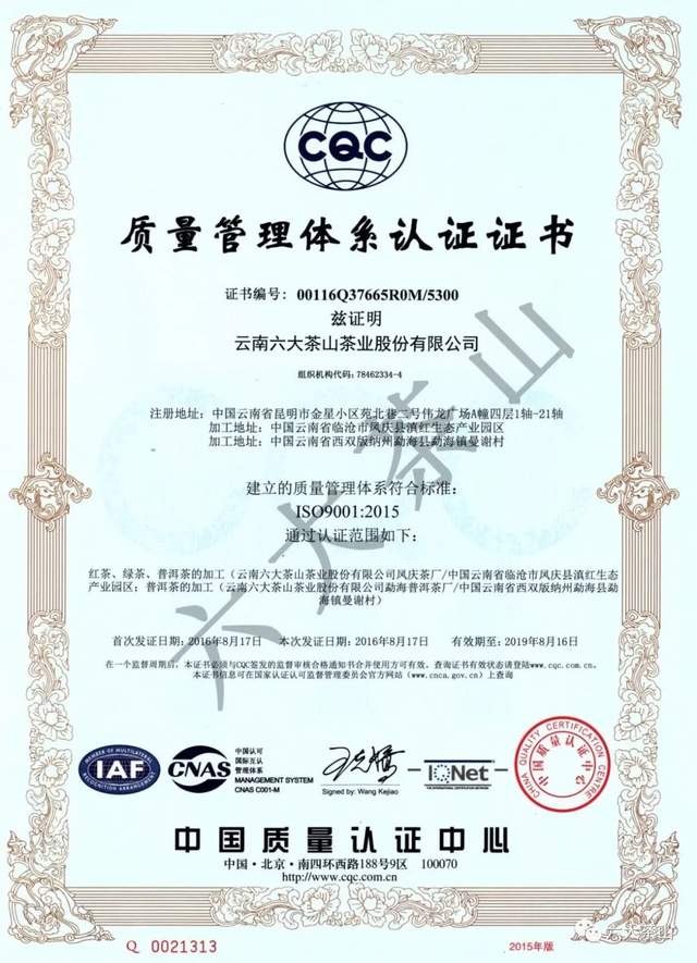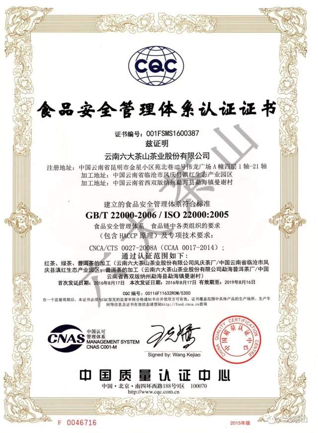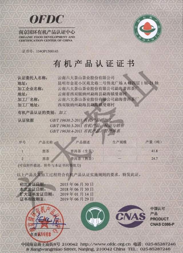 歷年來(lái),六大茶山公司獲得國(guó)家有機(jī)食品認(rèn)證,通過(guò)SC認(rèn)證、食品出口衛(wèi)生注冊(cè)登記,云南省10大名品、云南省老字號(hào)、有機(jī)產(chǎn)品認(rèn)證企業(yè)、出口食品生產(chǎn)企業(yè)、中國(guó)茶葉行業(yè)百?gòu)?qiáng)企業(yè)、云南首批年份普洱茶質(zhì)量保薦溯源企業(yè)、云南首款曬青茶質(zhì)量保薦溯源企業(yè)、HACCP體系認(rèn)證企業(yè),通過(guò)ISO9001質(zhì)量管理體系認(rèn)證,ISO22000食品安全管理體系認(rèn)證。
