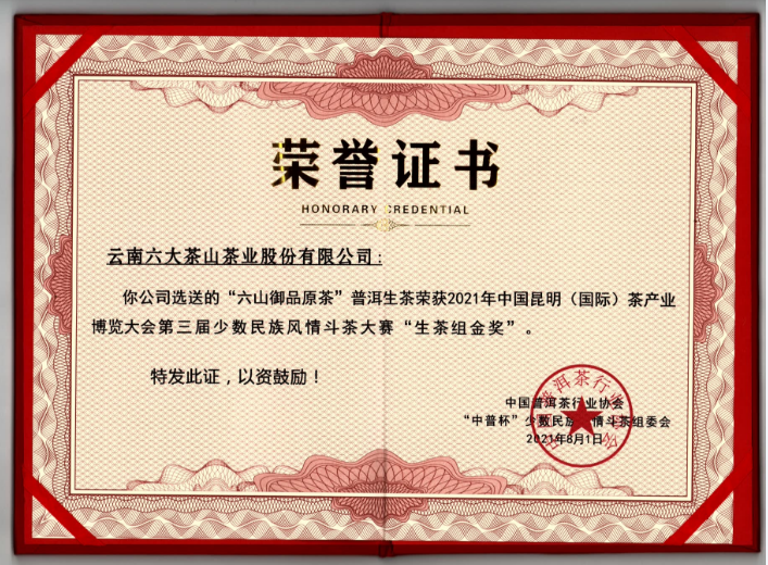 六大茶山“六山御品原茶”普洱生茶榮獲本次斗茶大賽“生茶組金獎”